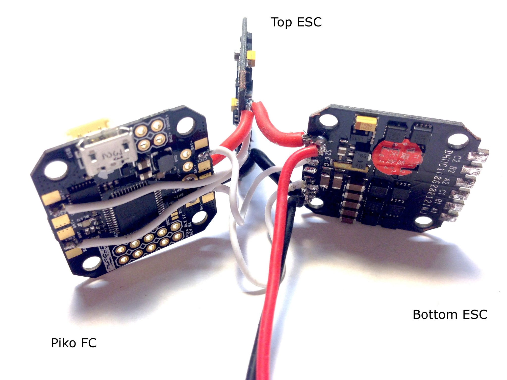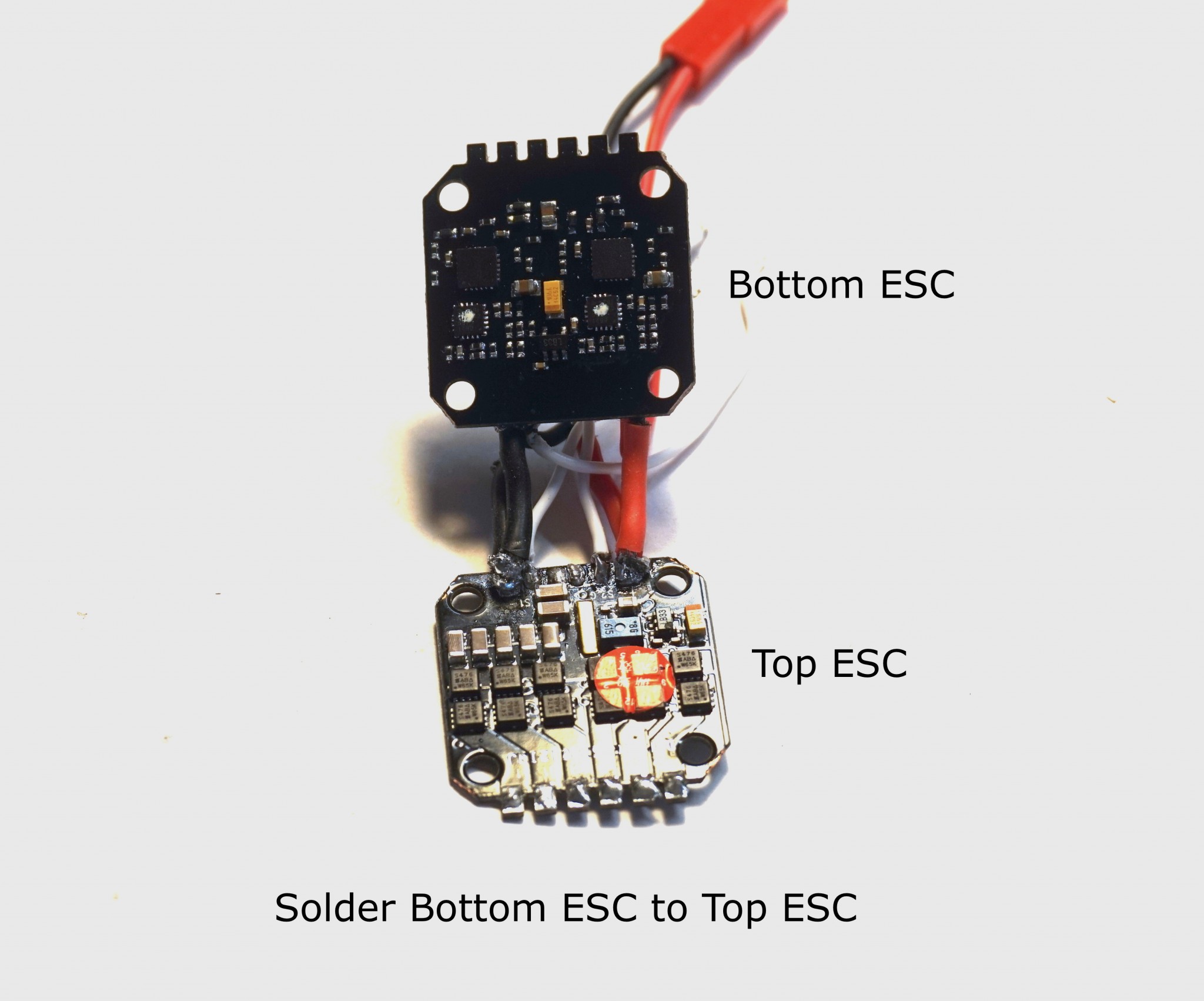 Before I saw the build guide I was thinking about wiring the stack up like in this photo with one ESC rotated 180 degrees.