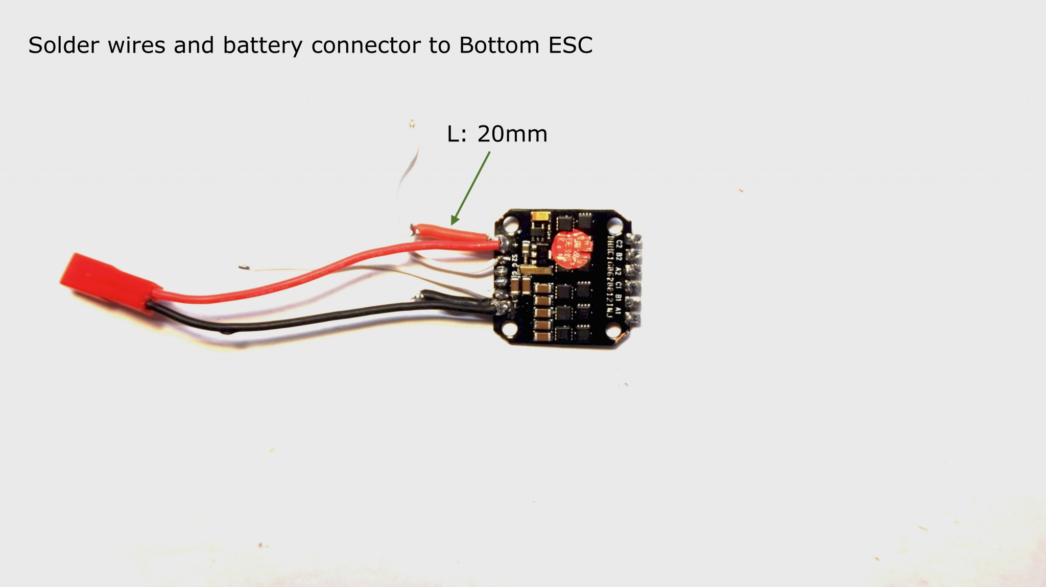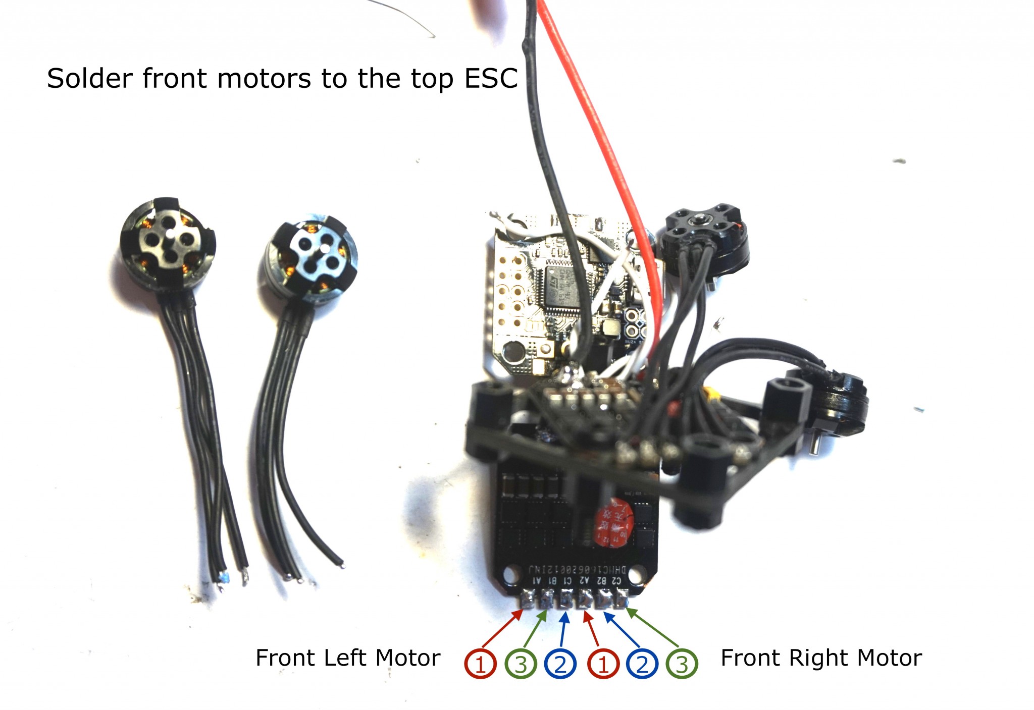 Measure how much wire you will need, cut off the excess and solder front motors to the Top ESC: