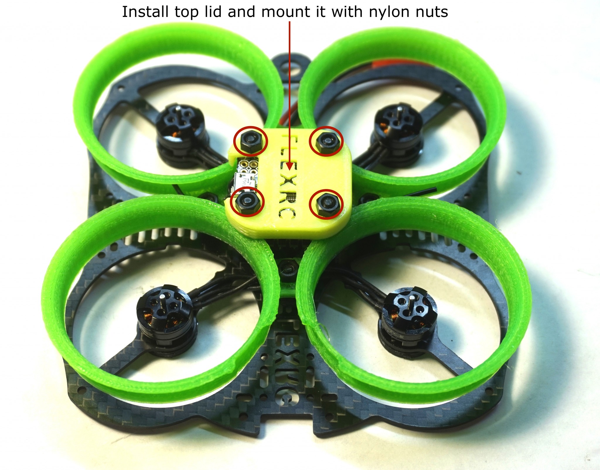 Put flight controller on standoffs, make sure that lemon-rx wires will be inside, so ducts can be installed:
