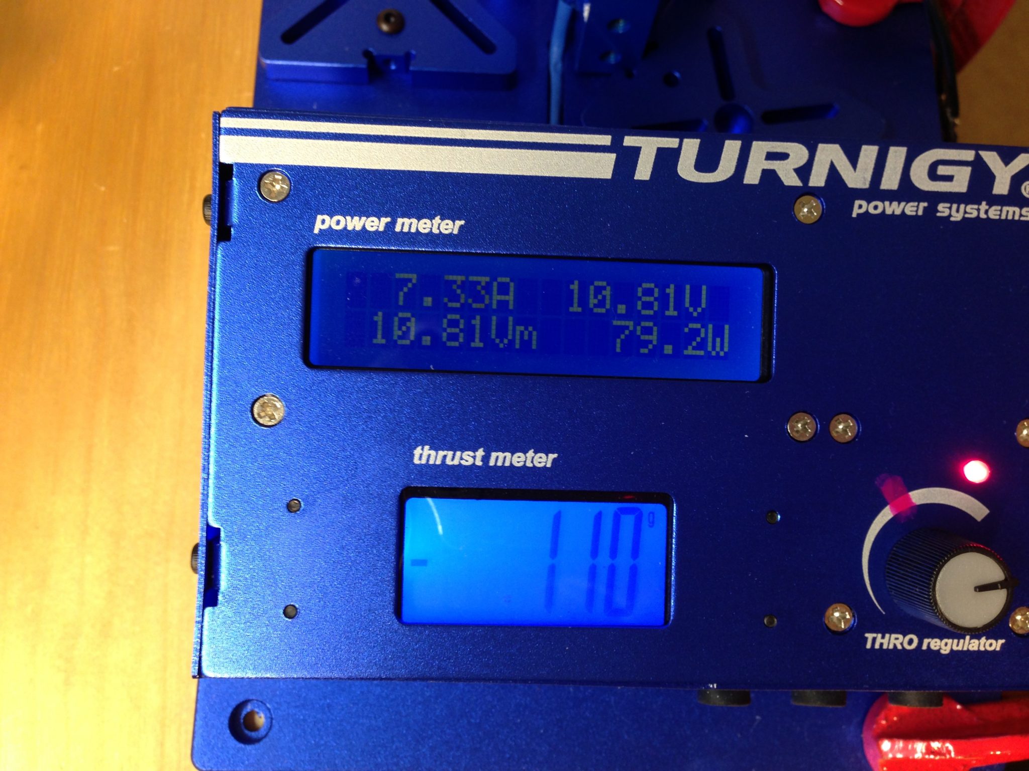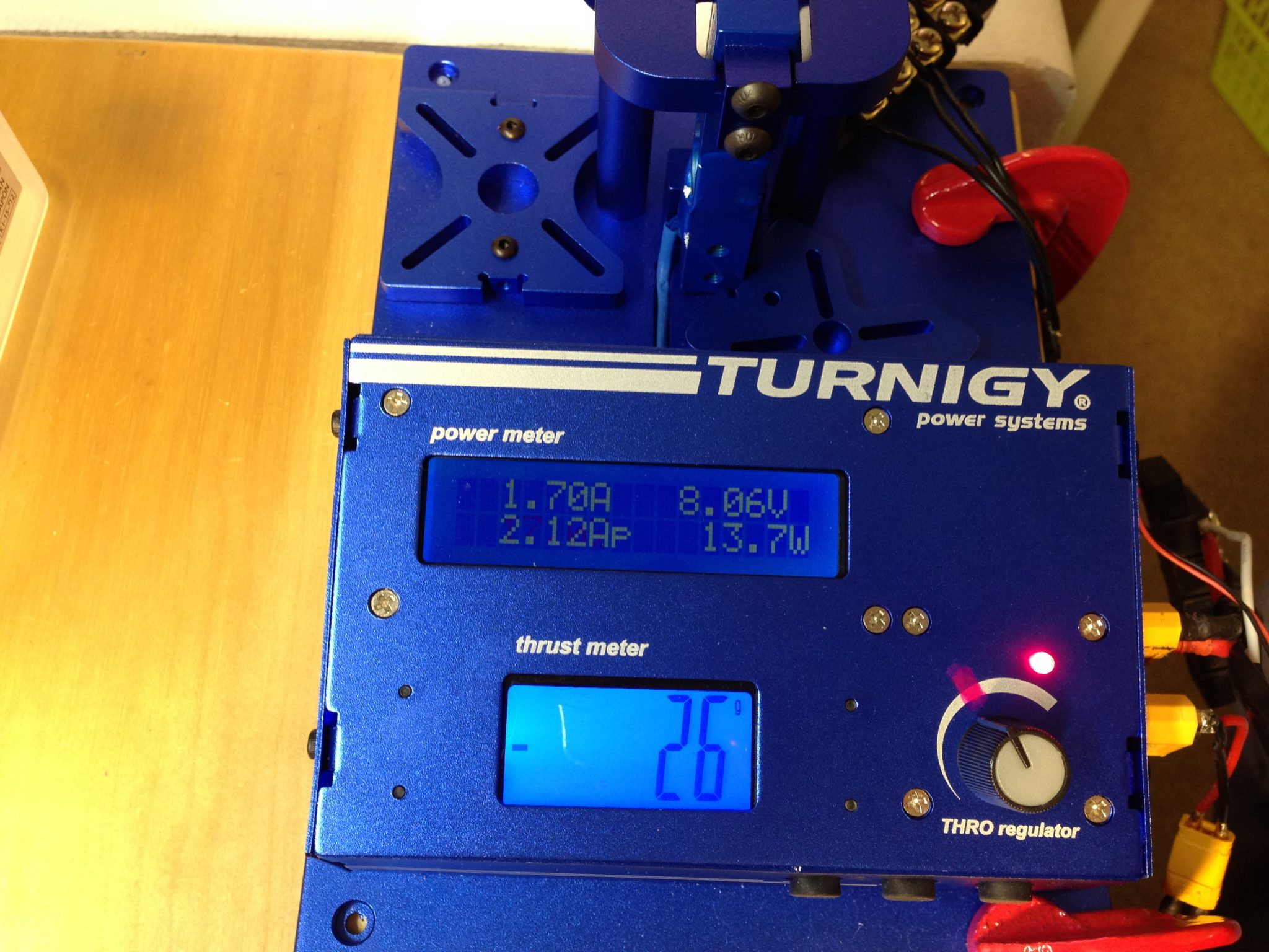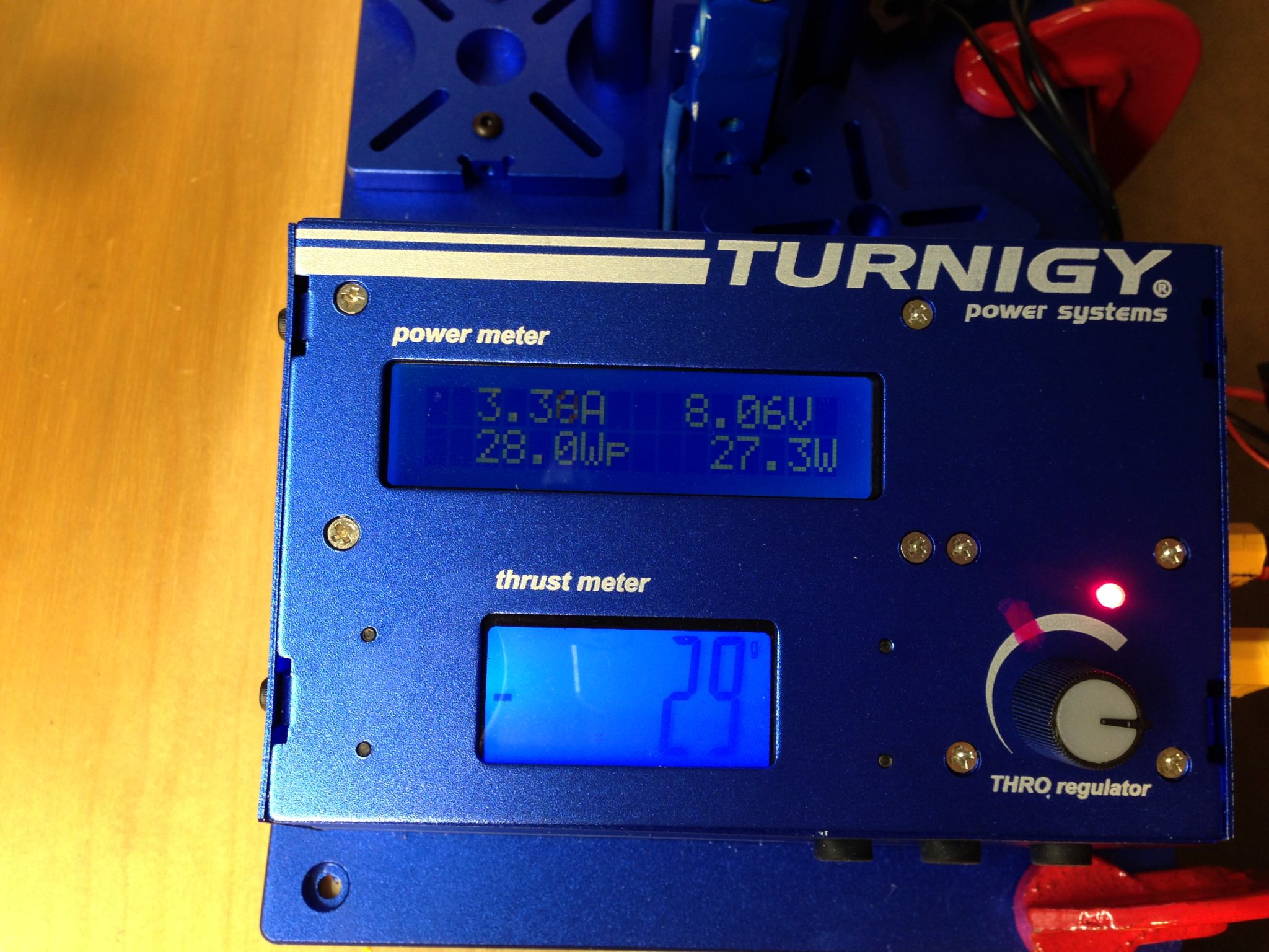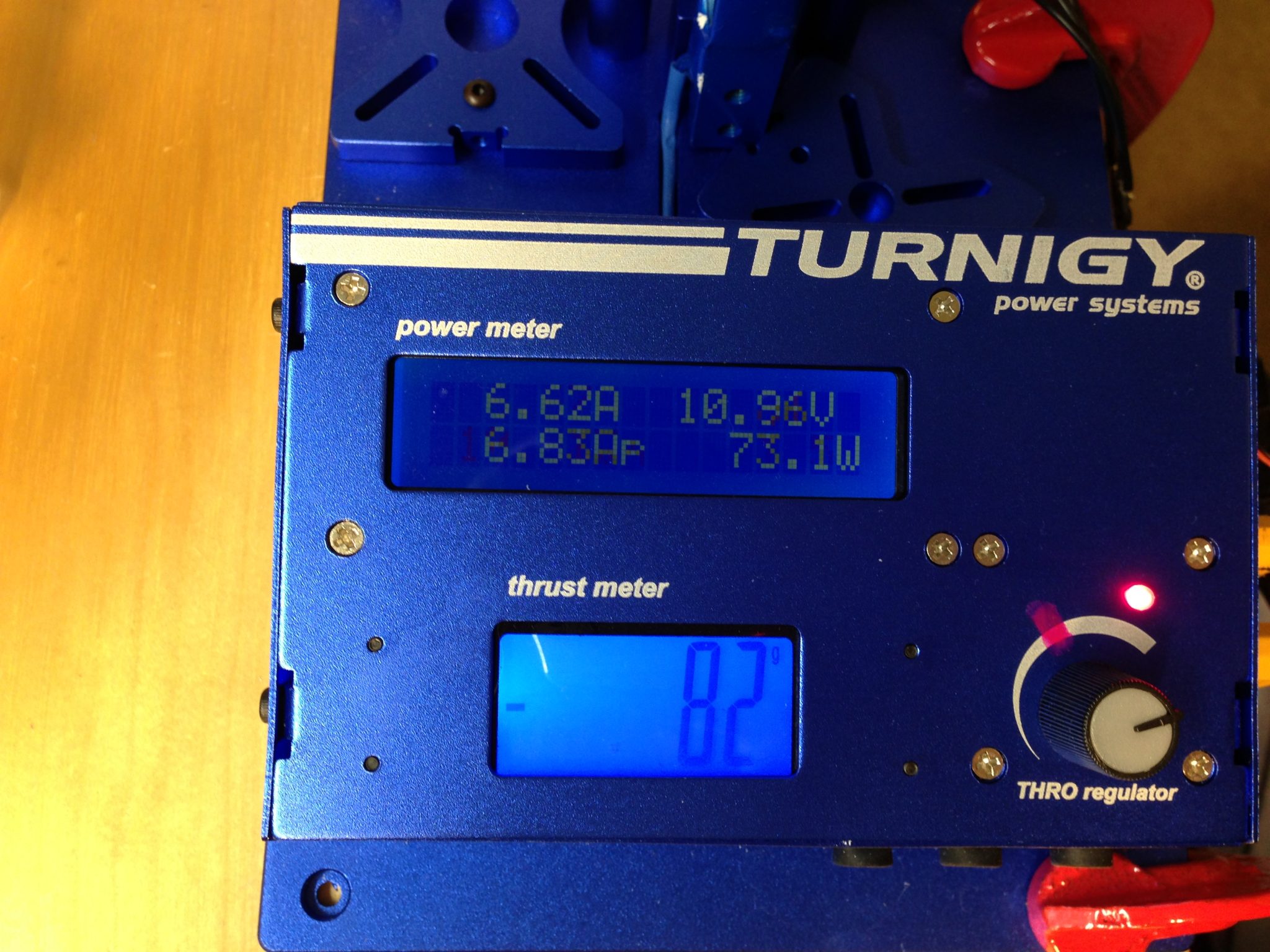 | Motor | Propeller | Throttle | Amps | Watts | Thrust | g/W |
