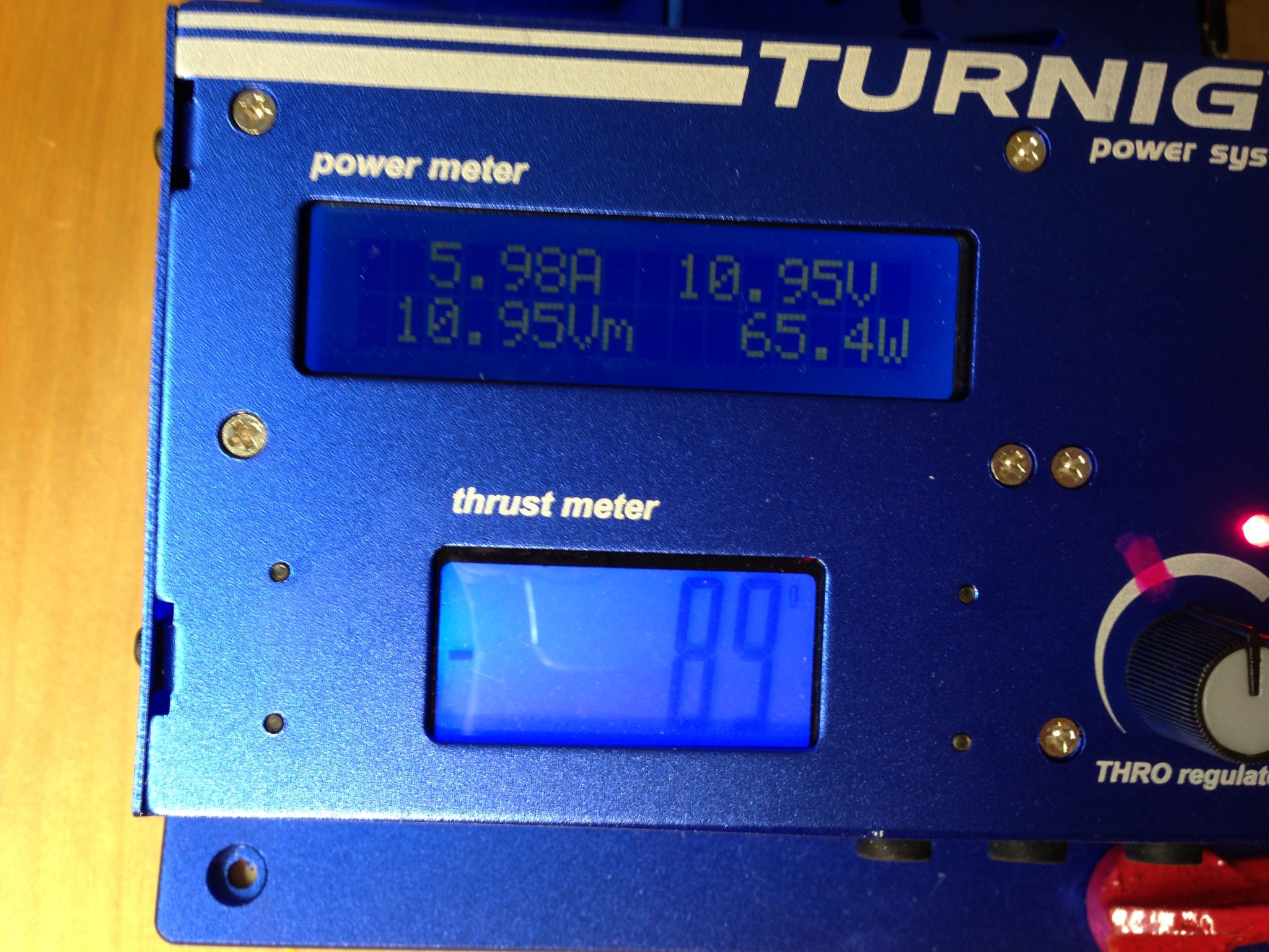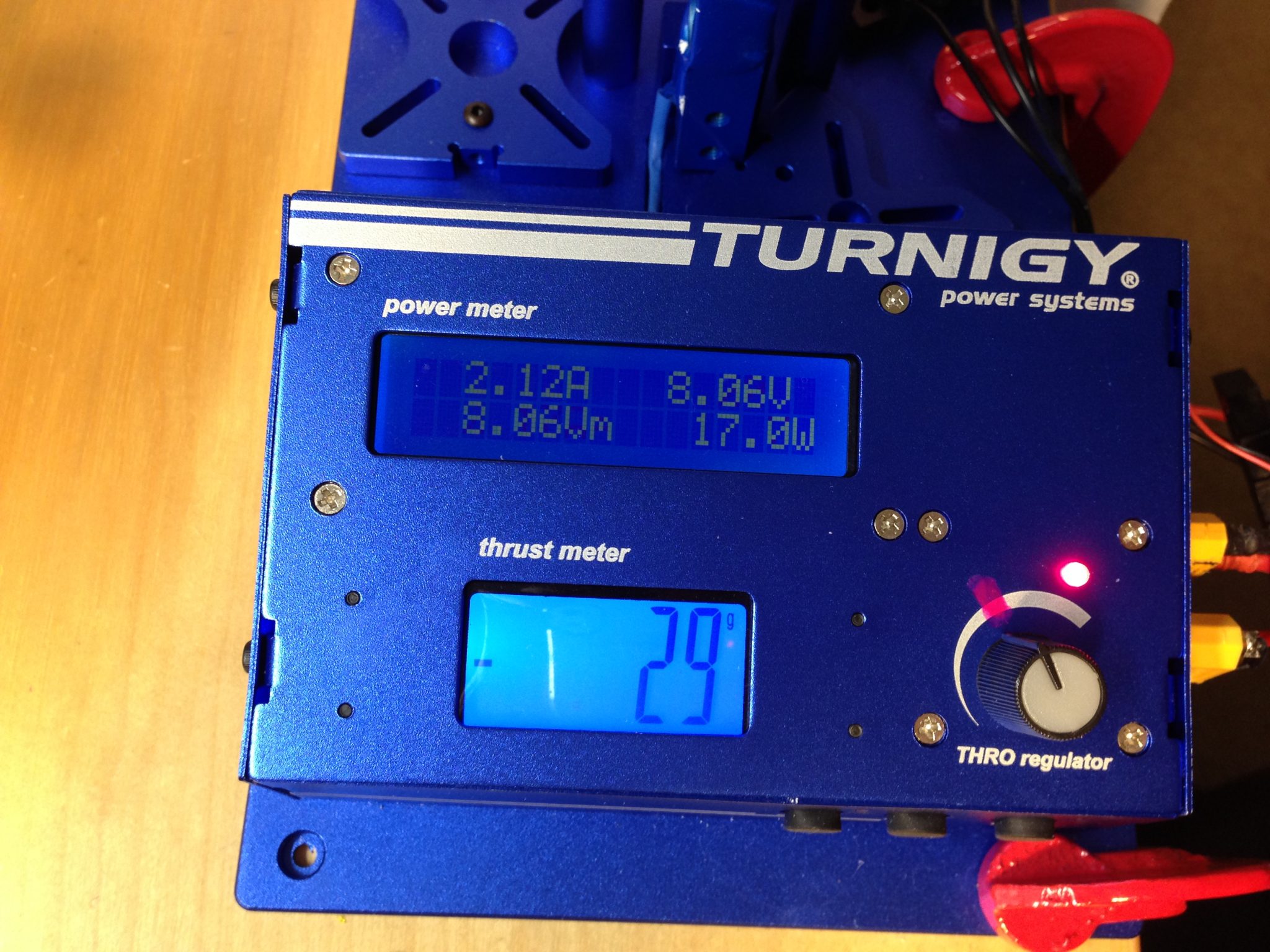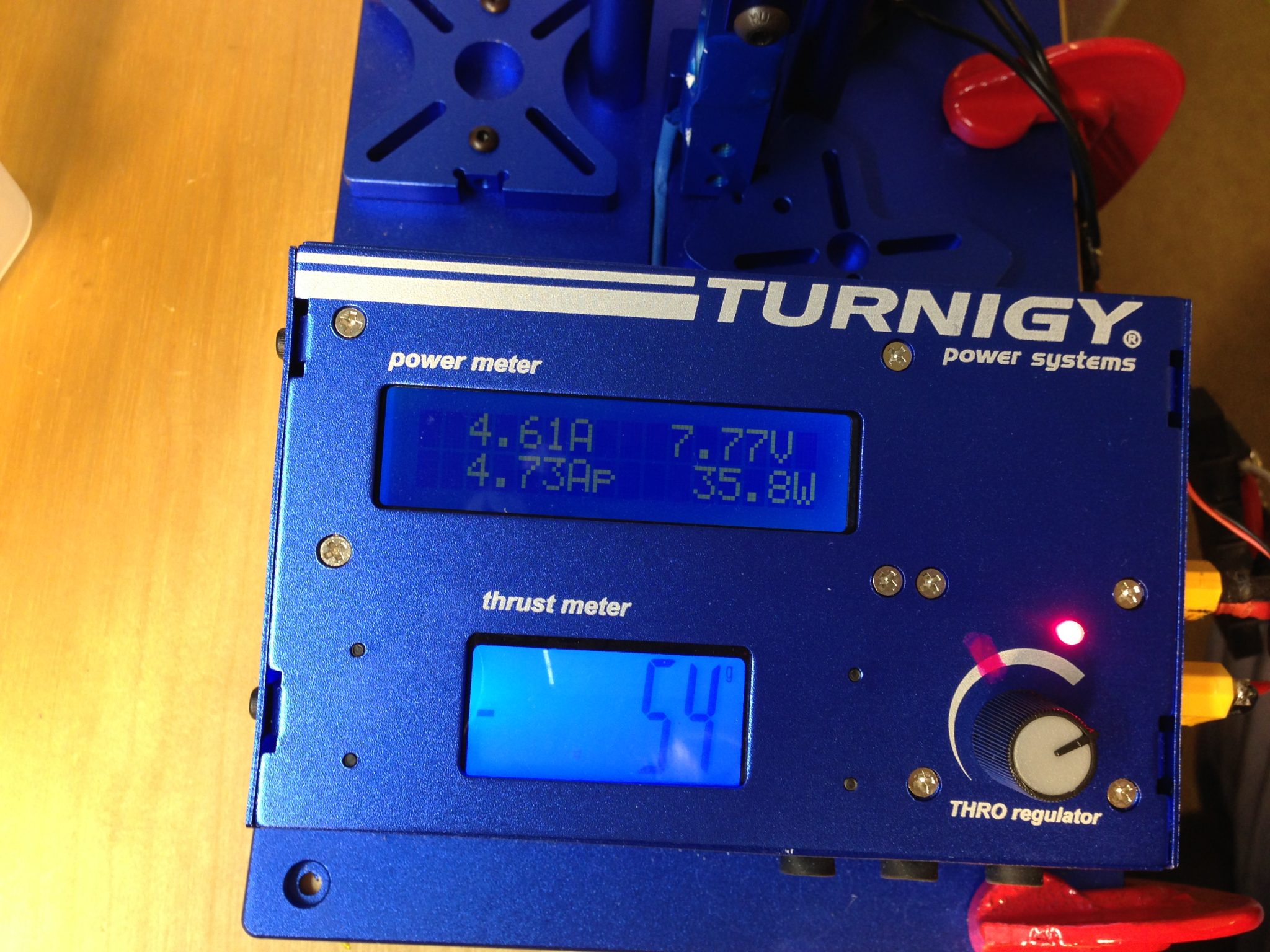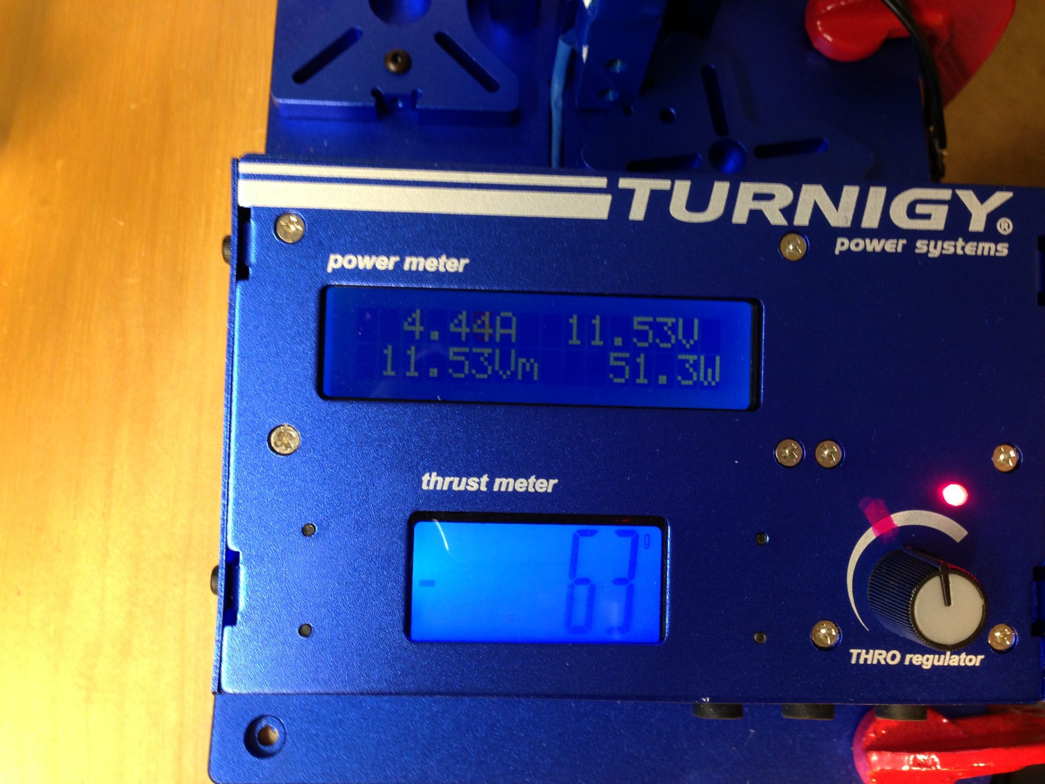 | Motor | Propeller | Throttle | Amps | Watts | Thrust | g/W |
