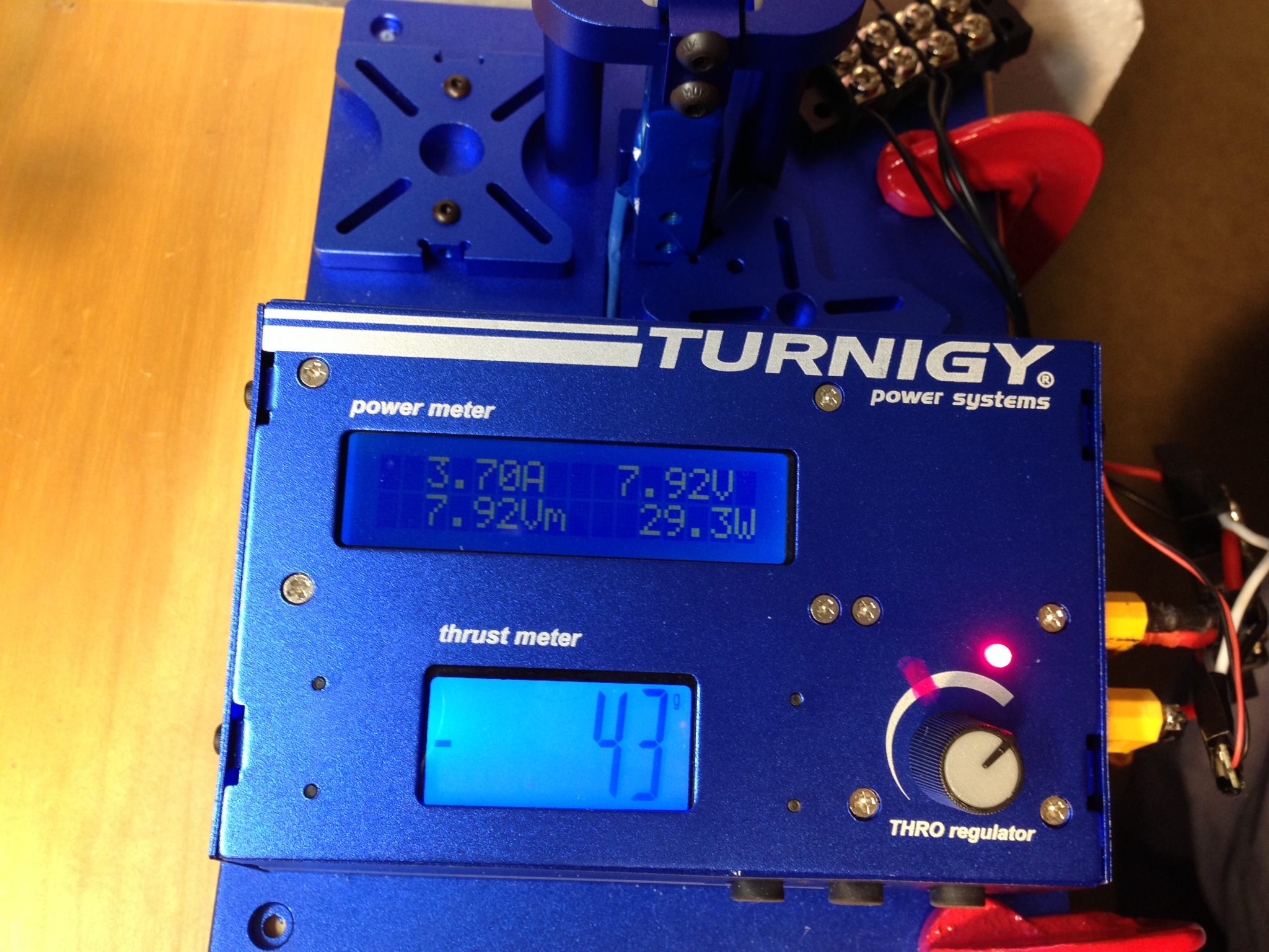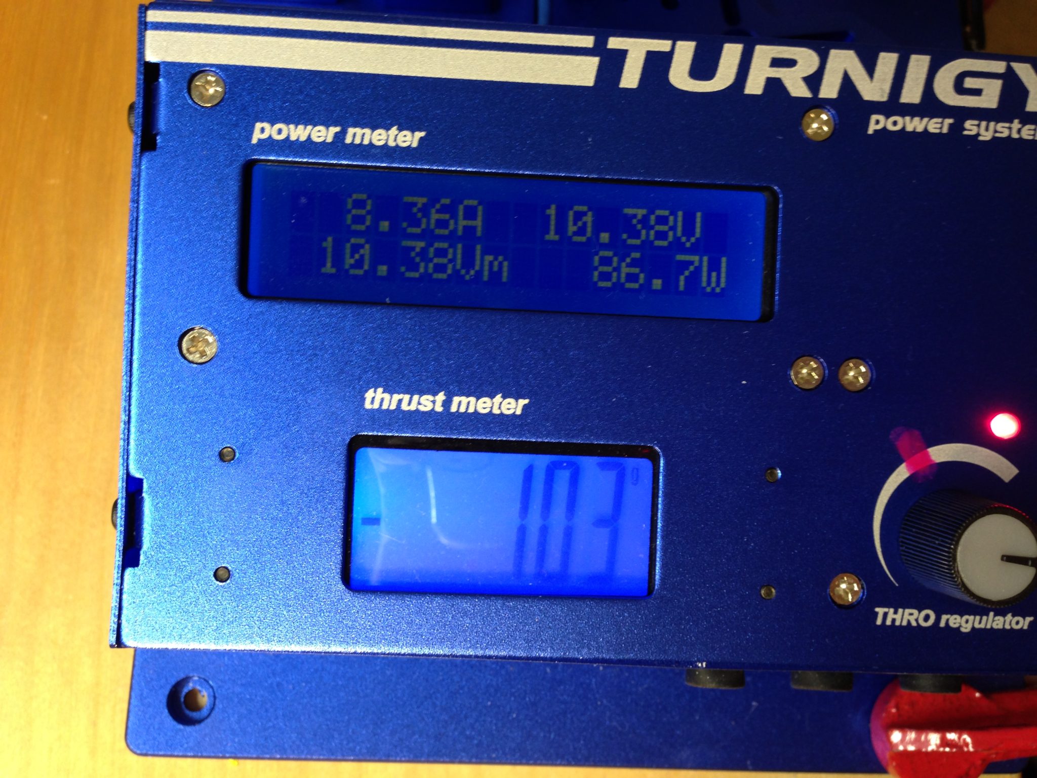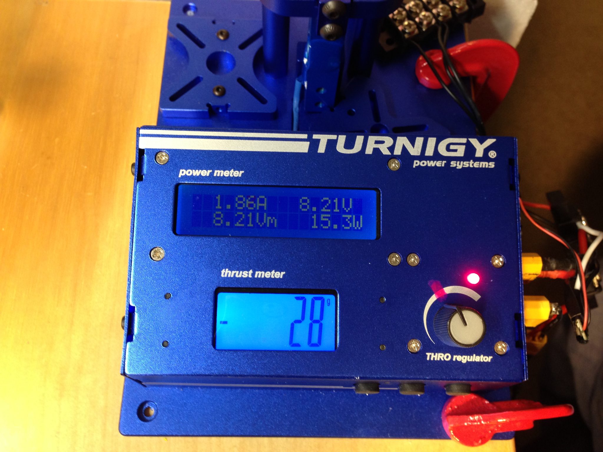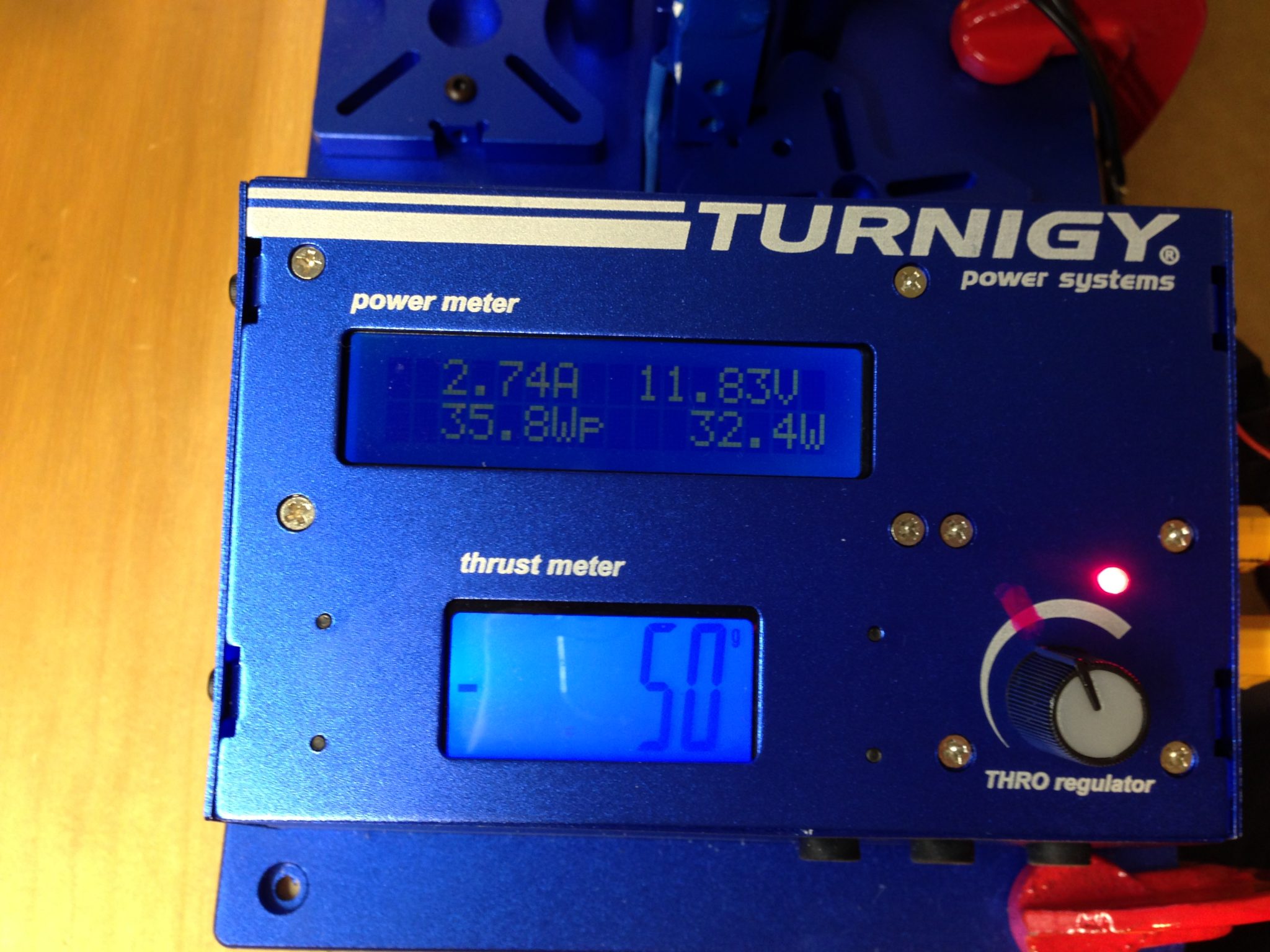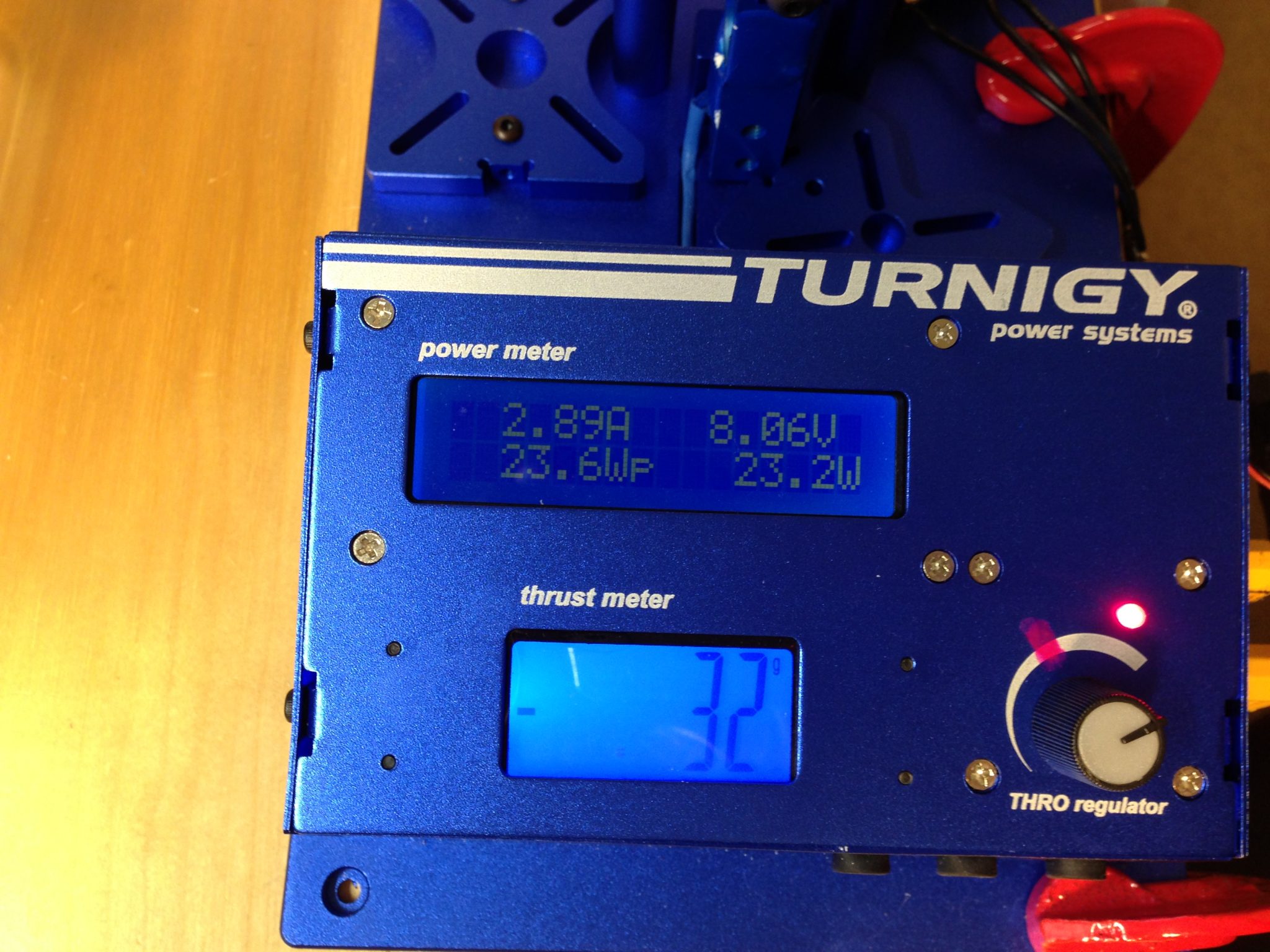 | Motor | Propeller | Throttle | Amps | Watts | Thrust | g/W |