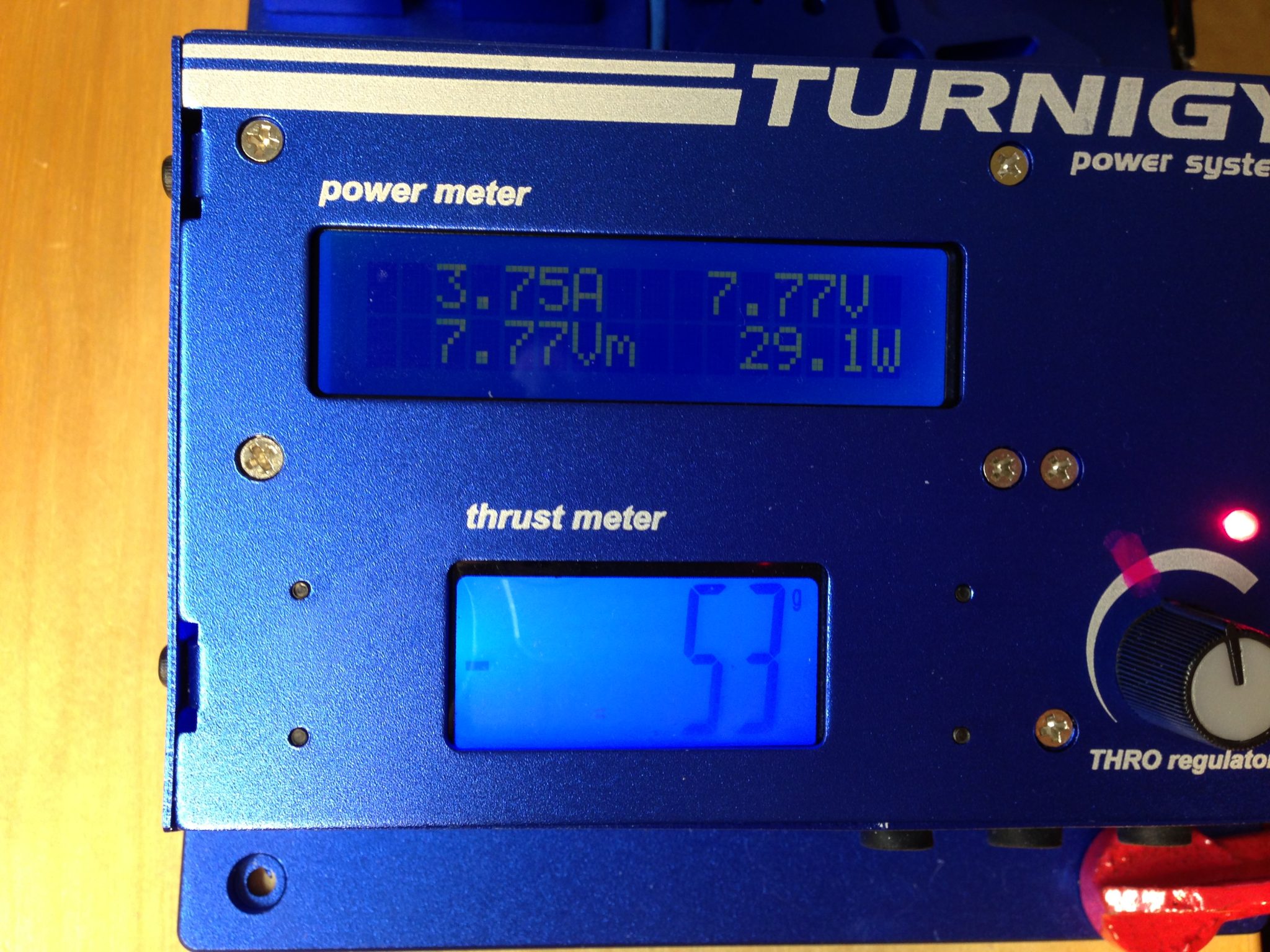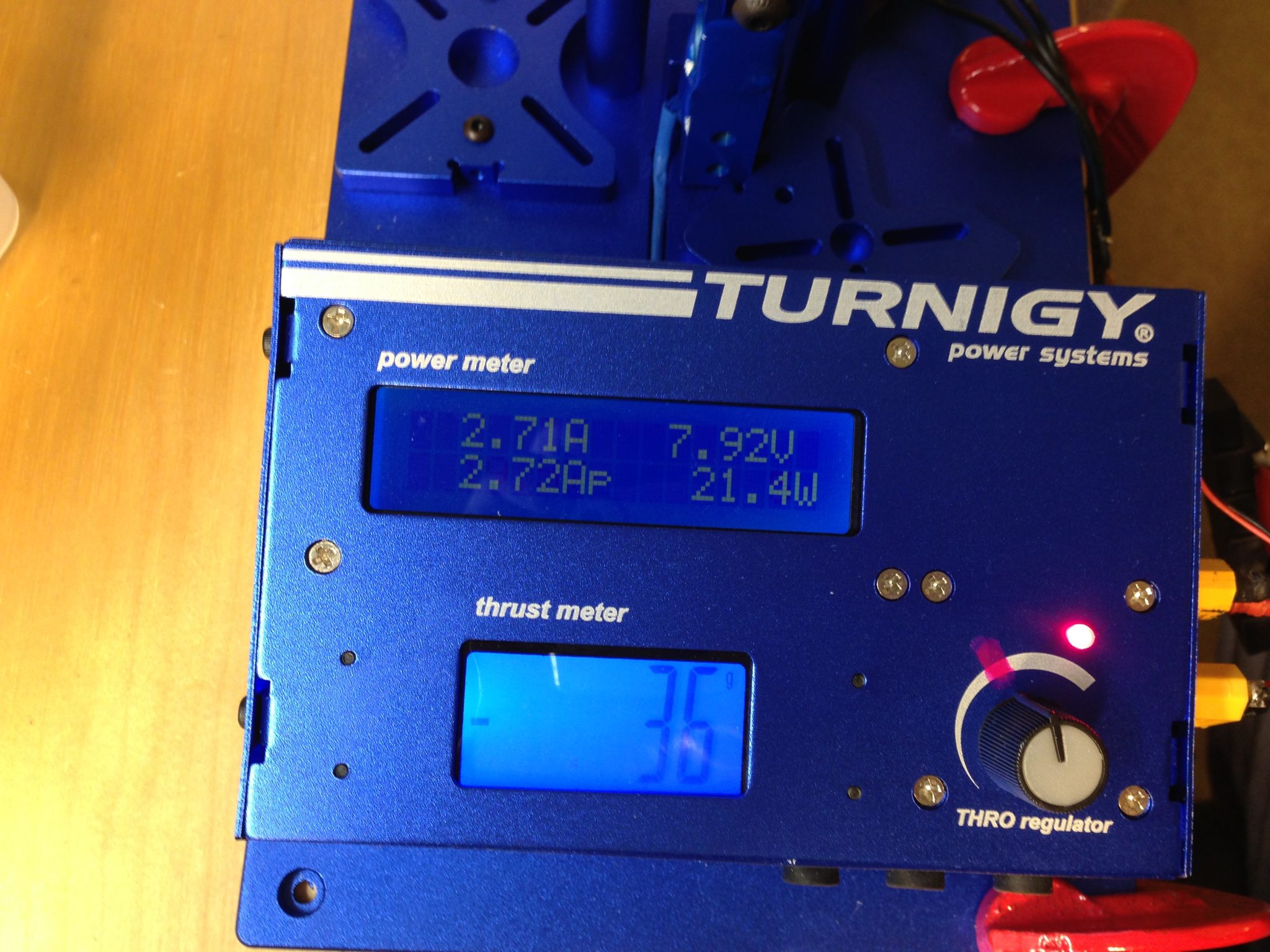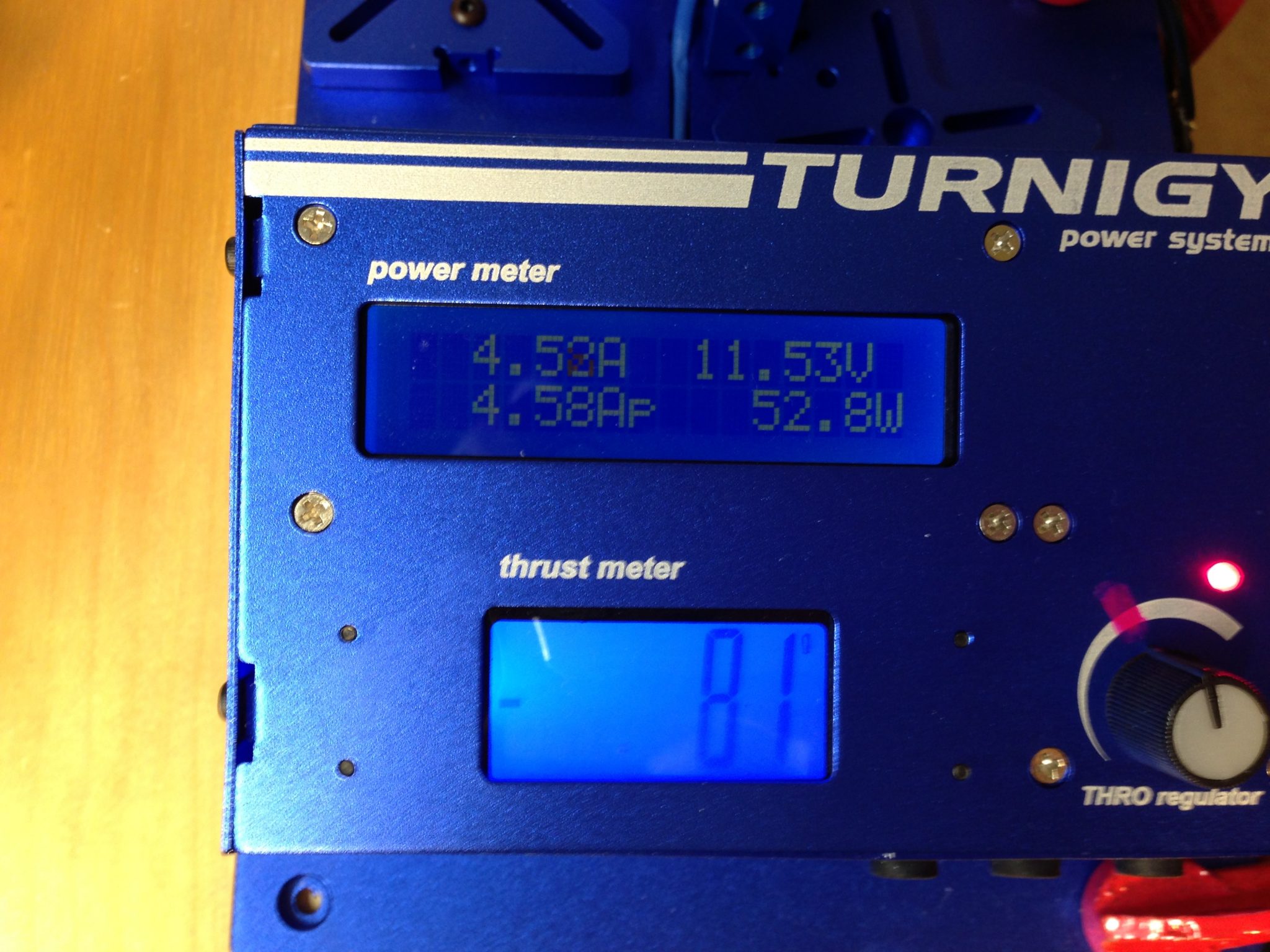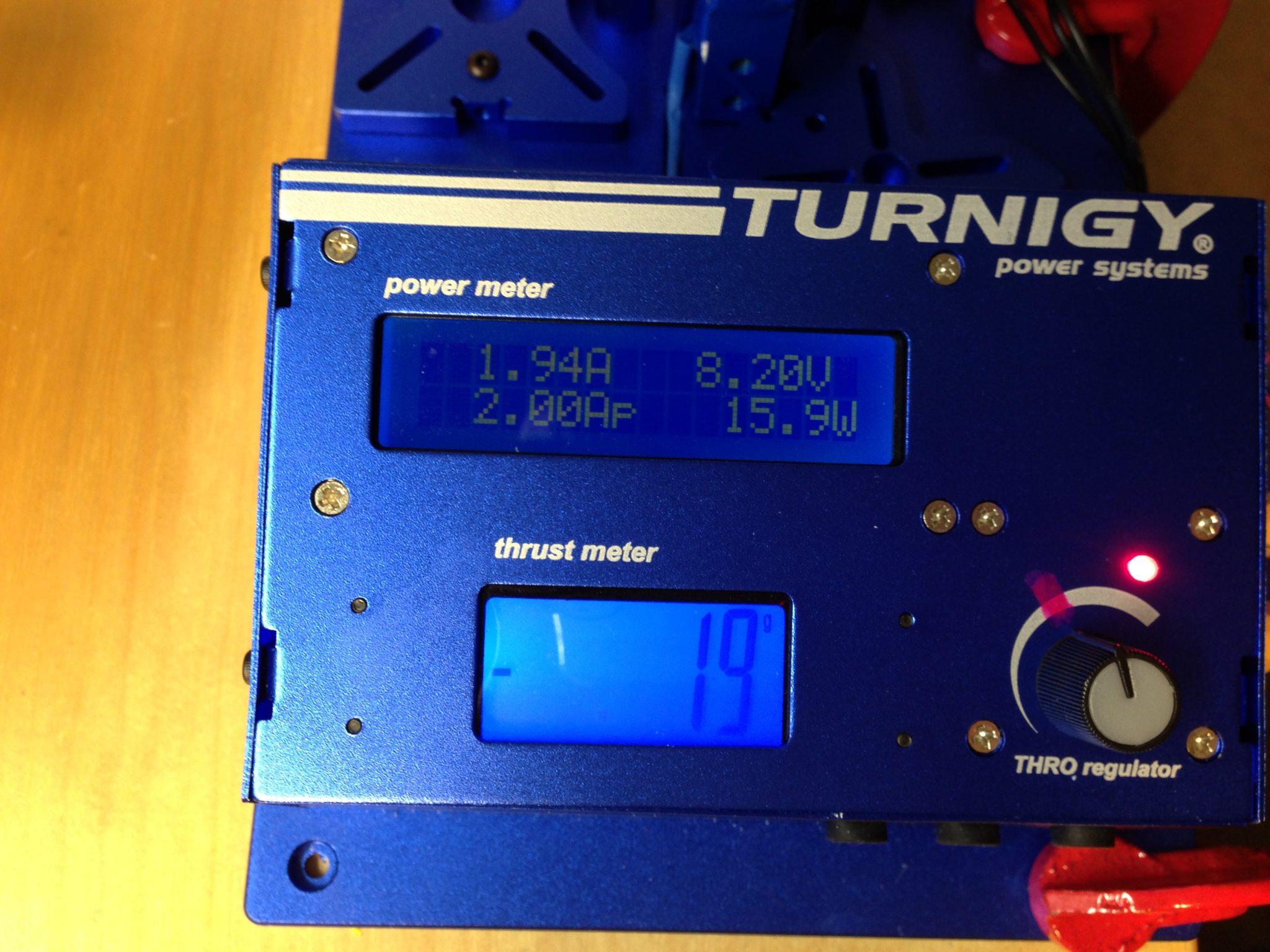 | Motor | Propeller | Throttle | Amps | Watts | Thrust | g/W |