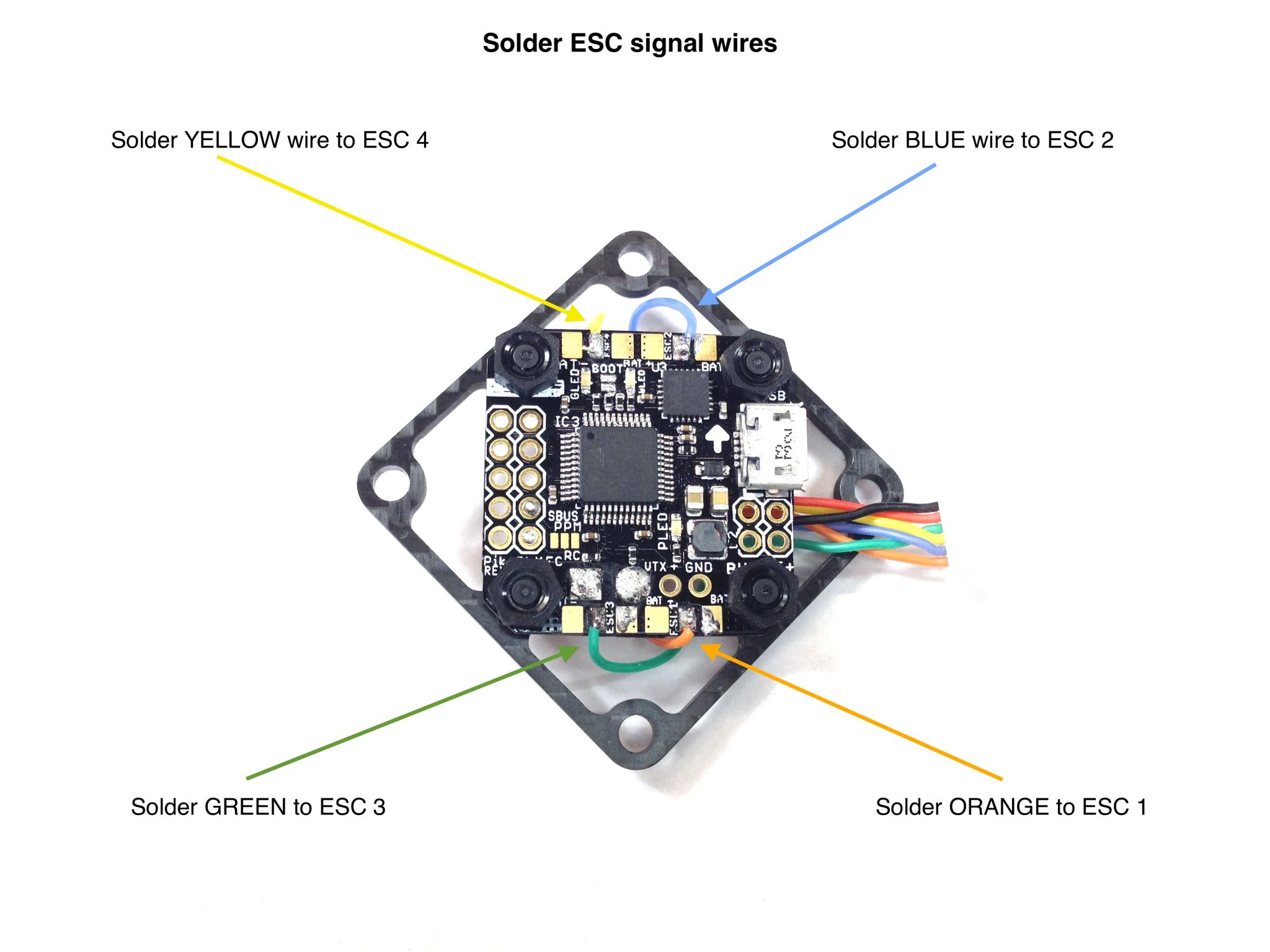 Use nylon screws to screw FC to ESC and insert signal wires plug into ESC.