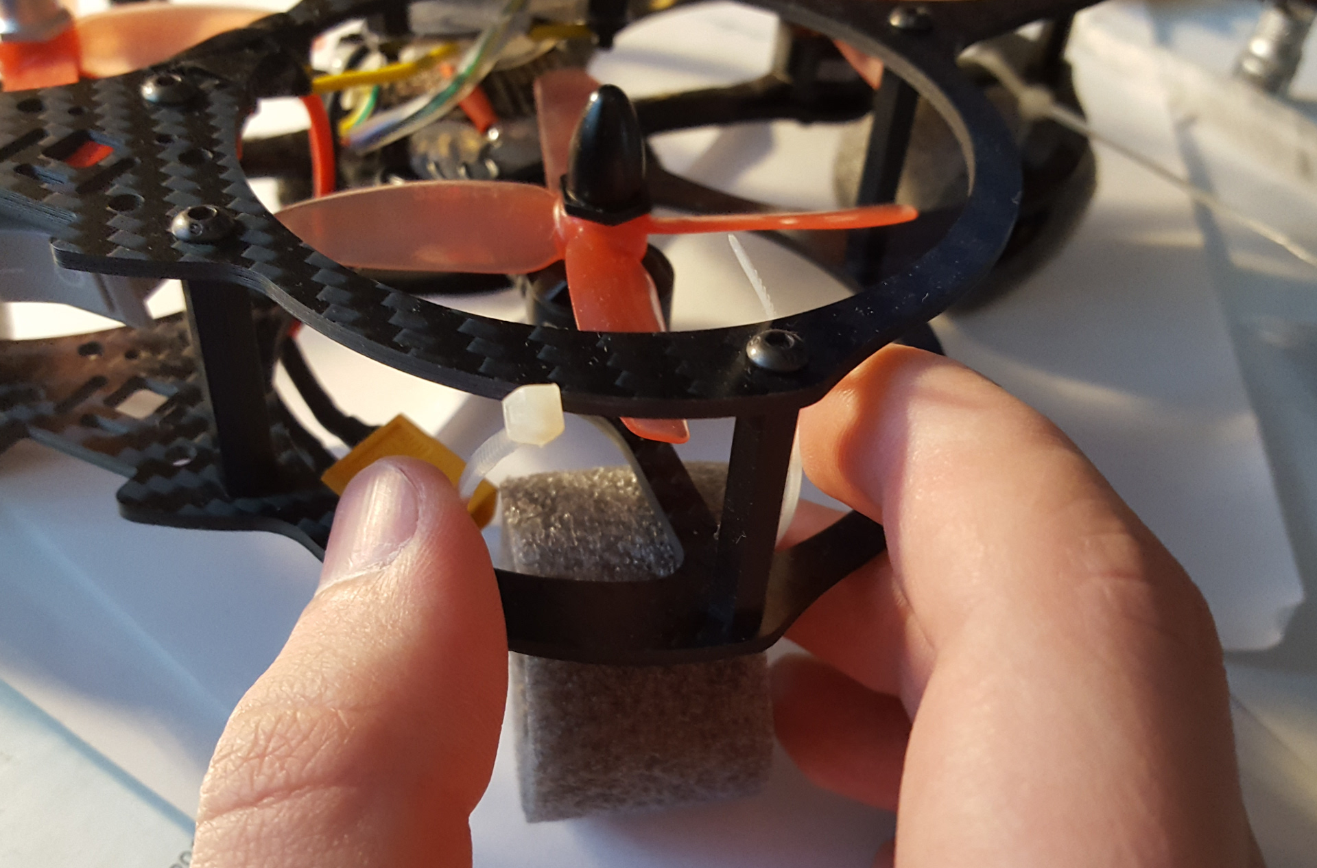 At first I added legs made of pipe heat insulation I got on the market near me. Initially I tried to use nylon spacers as legs, but they broke too frequently. Legs allowed me to move battery to the bottom space and move the center of mass lower. That indeed helped in terms of control.