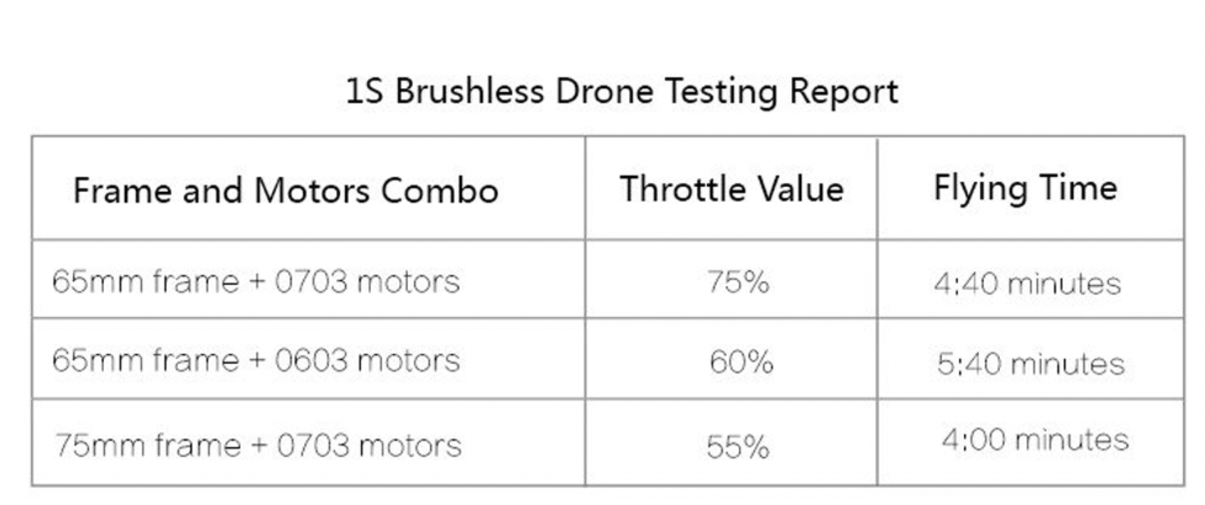 - All throttle values are tested on full charged 550mAh batteries.