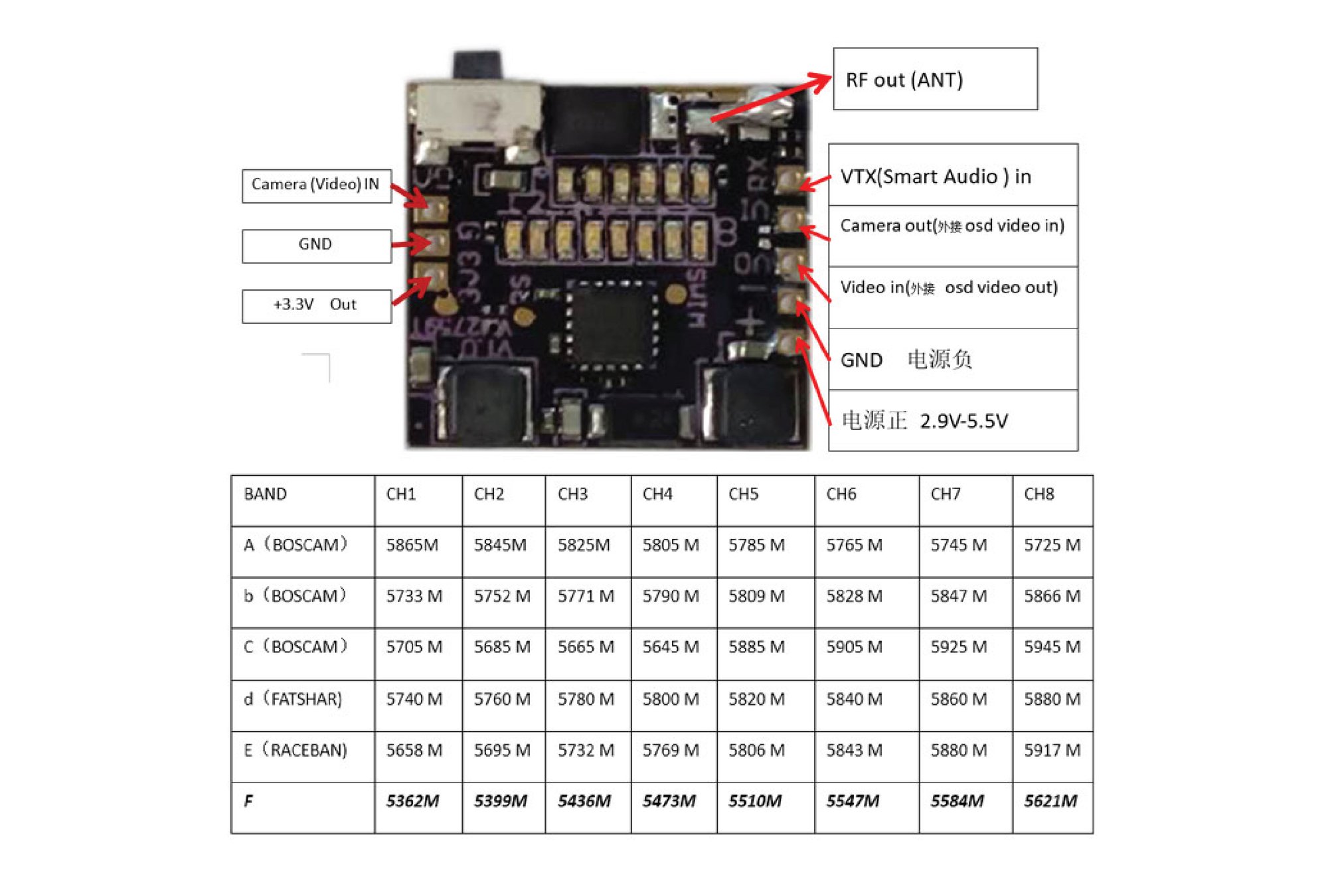 Channel Indicate CH1~CH8 Channel indication with 8LEDS and A~F frequency group Indicate with 6 LEDS