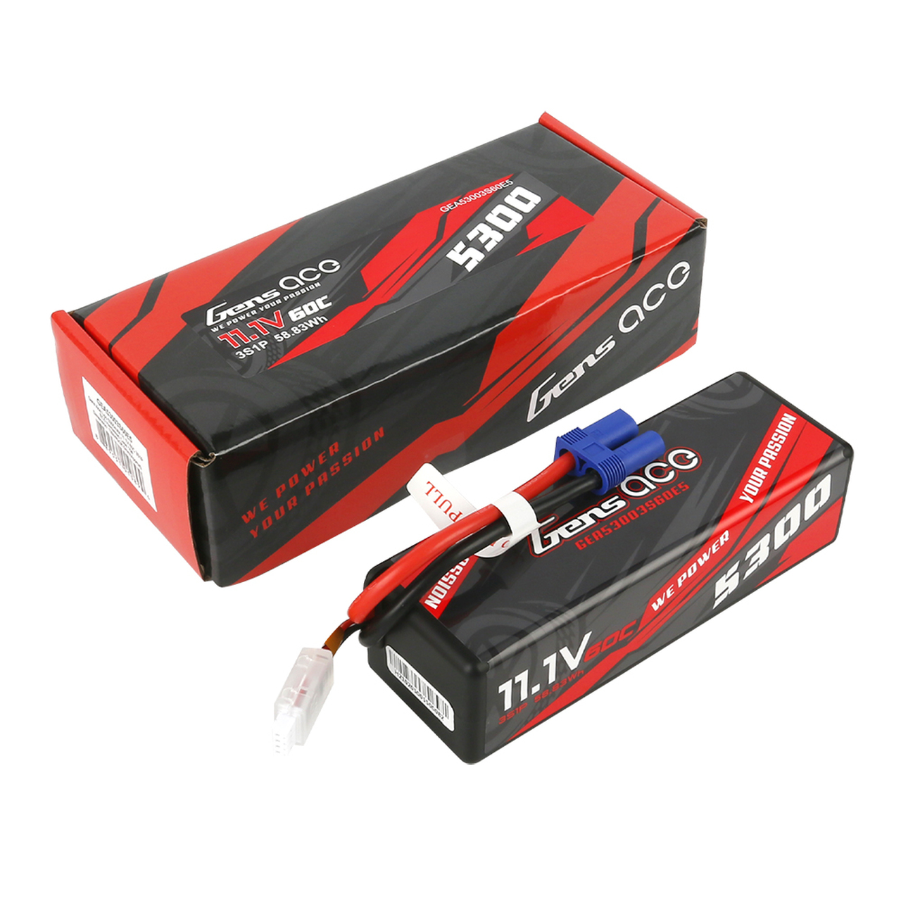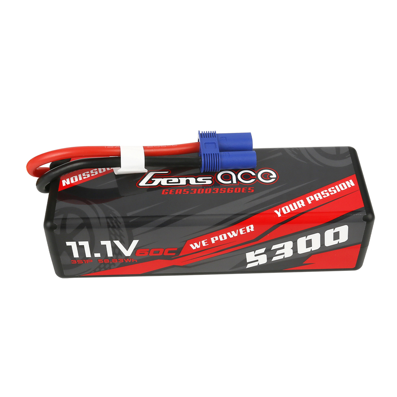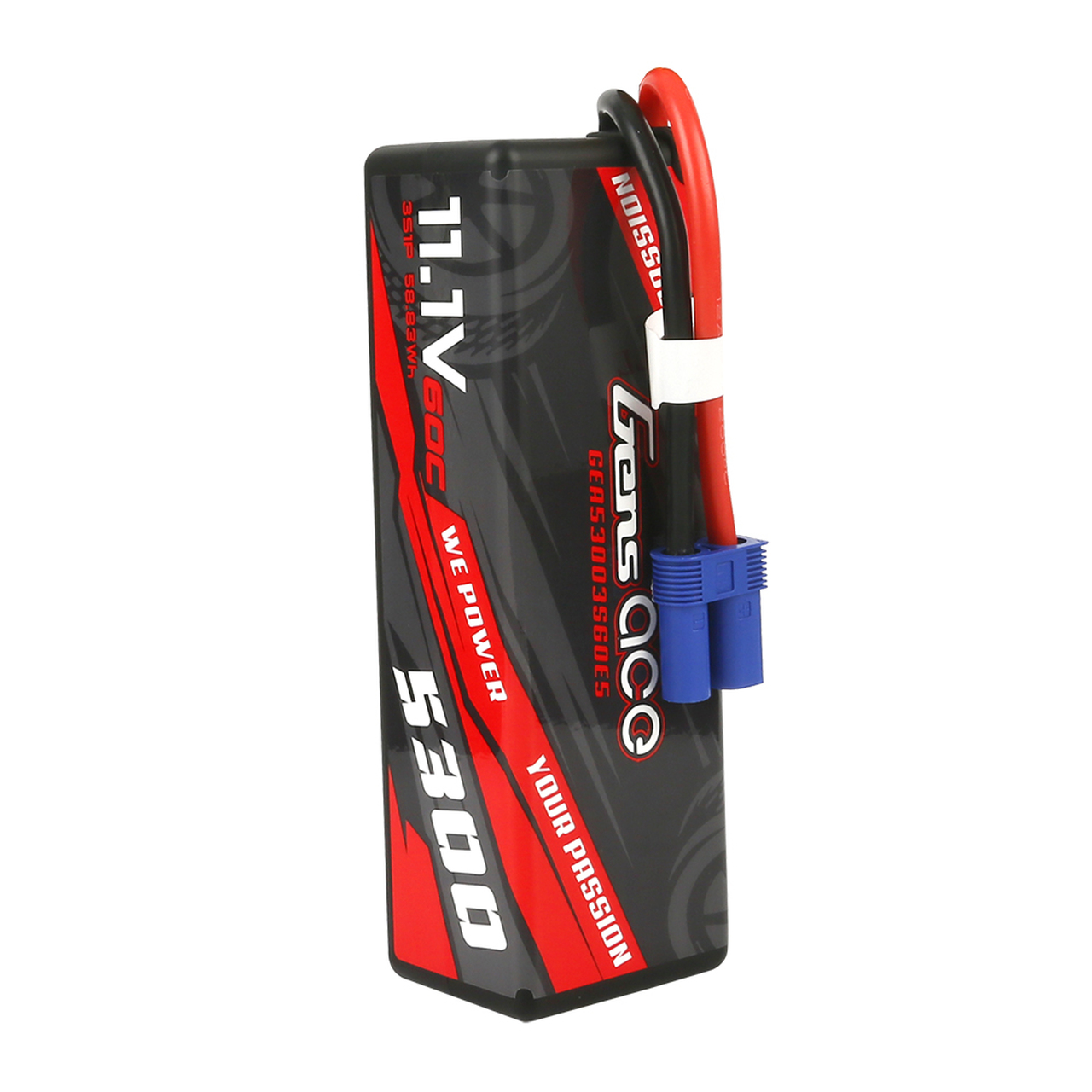 Gens ace 5300mAh 11.1V 60C 3S1P HardCase Lipo Battery is designed for your RC cars with serious performance in mind. The hard protective case gives the battery well protected no matter you are crawling, bashing or racing.