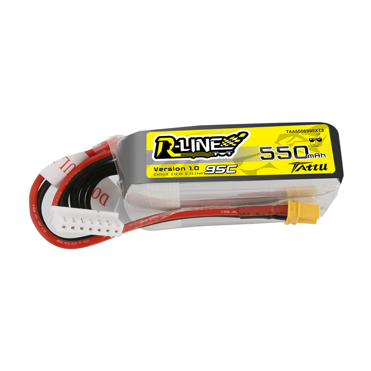 Tattu R-Line 550mAh 22.2V 95C 6S1P Lipo Battery Pack with XT30 plug has full capacity and discharge rate. It is a high discharge rate FPV racing lipo battery. The 95C gives you enough power under load. It is very compact in size and very light in weight. Works perfect with your Multirotor FPV from size 100 to 180.